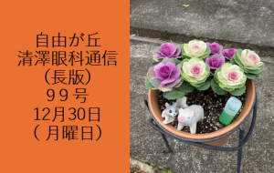 ブログを元に、最近の話題を取りまとめてこの「自由が丘清澤眼科最近の話題:長版)と、それから記事を厳選したメルマガの発信をしています。今回(12月29日)で99号。メルマガ読者数は患者さんを中心に(12月21日で)933人になりました。(⇒視聴登録募集。ご登録はこちらから)、登録取り消しも簡単にできます。さて、一度読めていたのに、最近メルマガ配信が中断したという方は、あなたの携帯電話の迷惑メールボックスに入っている可能性がありますので来院時に当院職員にご相談ください。