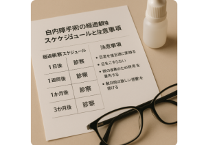 | 翌日(手術翌日) | 傷口の確認、炎症・眼圧チェック、眼内レンズ位置確認 | 必ず受診してください。痛み・強いかすみ・充血があればすぐご連絡を。(手術した医院で診ることが多いでしょう) |