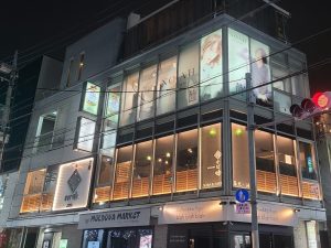 入店は午後7時。お店は予約席の札も含めて早々にお客さんでほぼ埋まっておりました。入り口は外階段からもエレベータでも入れる構造です。学生のバイトらしい若い男性3人と女性1人が店頭に立って対応してくれました。熟練者というよりは初々しさが感じられました。