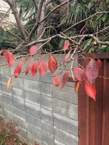 (これは高円寺の他人の家の柿の葉っぱですが、美しく赤くなっています。)我が家の柿の木は大きく、家族だけではとても収穫しきれません。そのため高い枝に残る実は「鳥の餌」と割り切っています。実際、残った柿は野鳥の冬の自然の貴重な食料になります。ところが最近、私の故郷・松本周辺では、里山に熊が柿を求めて下りてくる例が増えていると聞きます。背景には耕作放棄地の増加や、山の生態系の変化があると考えられています。人と野生動物の接点が増えることで、農作物被害や人的被害も増える傾向にあり、地域としての対策が求められる状況です。
