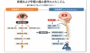 眼の痛みは、単なる目の炎症や傷だけで説明できないことがあります。とくにドライアイや角膜障害が治っているのに痛みが続く場合、その背景には「痛みの感作(かんさ)」と呼ばれる神経の変化が関わっていることが、近年の研究で分かってきました。
