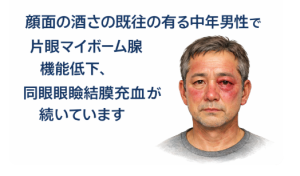 [No.4484] 顔面の酒さの既往の有る中年男性でマイボーム腺機能低下、片眼眼瞼充血が続いています
