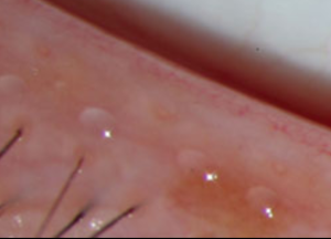 マイボーム腺は、上下のまぶたの縁に並んで存在する脂の腺で、涙の表面に油の膜を作り、涙が蒸発するのを防ぐ大切な役割を担っています。ところが、この腺の出口が詰まると、脂が外にうまく出られなくなり、出口の部分に黄色から黄白色の脂がたまって、盛り上がって見えるようになります。これがマイボーム腺梗塞です。