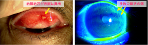 結膜結石そのものはとても小さいため、深い位置にある間は無症状のことも少なくありません。ところが、表面に露出してくると、