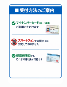 窓口における保険証の提示につきまして 2026.03.21 Tweet Share Hatena Pocket RSS feedly Pin it ■ マイナンバーカードおよび保険証のご利用について 当院では、窓口にてマイナンバーカード(カード本体)を用いた資格確認に対応しております。 一方で、スマートフォンに搭載されたマイナンバーカード機能(モバイルでの提示)には現在対応しておりませんので、あらかじめご了承ください。 また、従来の健康保険証をご提示いただいた場合には、これまで通り紙の保険証による受付も可能です。 Tweet Share Hatena Pocket RSS feedly Pin it 12月5日金曜日 午後休診 前の記事