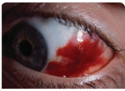 一方、前房出血とは、黒目(角膜)と虹彩のあいだの空間に血液がたまる状態です。軽い場合は、血液がわずかに混じる程度で、注意深く経過を見ることで自然に改善することが多いです。ただし、再出血や眼圧上昇といった合併症が起こることがあるため、結膜下出血よりも慎重な管理が必要になります。このほか網膜の黄斑部に浮腫を伴う場合もあります。
