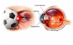 眼球打撲に伴う結膜下出血と軽い前房出血について、患者さんと家族向けの説明文を作ってみました。