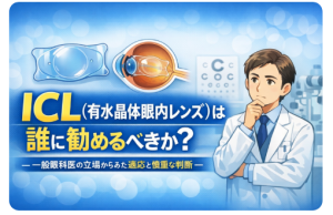 総じて、日本の一般眼科医におけるICLの位置づけは、「適切に選択された症例に対しては有効な選択肢となり得るが、第一選択として広く勧めるものではない」というバランスの上にあります。すなわち、眼鏡やコンタクトレンズで十分な視機能が確保されている場合には、まずその安全で確立された方法を継続することが基本であり、ICLはあくまで代替手段として慎重に検討されるべき治療といえます。