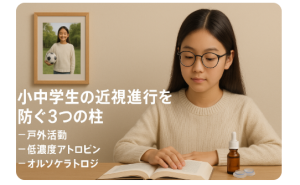 近視進行を抑えるためには、①戸外活動、②低濃度アトロピン、③オルソケラトロジーという3本柱を、年齢や生活に合わせて組み合わせることが大切です。最も基本は「戸外活動2時間」で、これは全ての子どもに推奨できます。そこに、より積極的な予防として低濃度アトロピン、さらに視力改善も兼ねたい場合はオルソケラトロジーを追加する考え方がよく用いられます。近視は一度進むと元には戻らないため、早期からの予防が将来の強度近視や眼の病気を減らす鍵となります。ご家族で「無理なく続けられる方法」を一緒に探し、長く続けることが何より重要です。