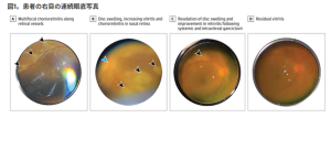 結果として、眼の所見はきわめて重篤でした。前方ぶどう膜炎、硝子体炎、多発性脈絡網膜炎、網膜血管炎、さらには視神経の関与まで認められました。すなわち、前眼部から後眼部、視神経に至るまで広範囲に炎症が及ぶ像です。診断はBウイルスによる髄膜脳炎を伴う全身感染として確定されました。