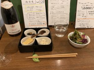 自由が丘でランチのシリーズを続けておりますが、今回は駅からほど近いビルの2階にある隠れ家的なお店「食堂 ムラッチョ」さんを、診療終了後の時間に初めて訪れました。本日は「豚の生姜焼き定食」をいただきました。香ばしく焼かれた豚肉に、やや甘めのタレがほどよく絡み、白いご飯が進みます。定食には味噌汁と小鉢4品+1品がつき、量・味・バランスともに満足のいくものでした。夕方にはワインを一杯添えるのも楽しみ方の一つ。店主のおすすめで、コート・デュ・ローヌ産シラー種の赤ワインを出してくださいました(注)。定食屋で気取らず1杯のワインを楽しめるのも、ムラッチョさんならではの魅力です。