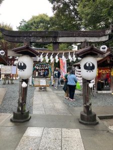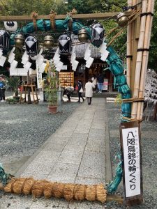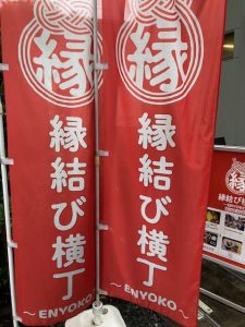 途中で立ち寄った熊野神社には、夏の名残りを感じさせる茅の輪くぐりのしつらえがありました。しっとりとした雨模様の中で、青々とした茅の輪が参道に立ち、清らかな空気が漂っています。その右脇には「縁結び横丁」と名づけられた小さな露店モールが続いており、軽食を並べる若い店員たちの声が柔らかく響いていました。