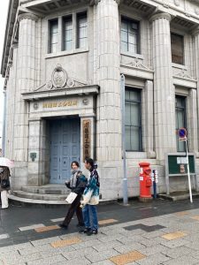 そのまま歩みを進めると、大正時代の洋風建築が残る「大正浪漫夢通り」に出ます。どこか懐かしい看板や、当時の面影をとどめた建物が並ぶ通りで、「大正」と名のついたカフェに入り、ホットカフェオレをいただきました。窓越しに通りを眺めながら、ゆったりとした時間が流れていきます。雨に濡れた石畳が光り、川越の町が一層しっとりとした風情を帯びていました。