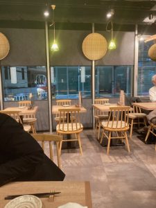 入店は午後7時。お店は予約席の札も含めて早々にお客さんでほぼ埋まっておりました。入り口は外階段からもエレベータでも入れる構造です。学生のバイトらしい若い男性3人と女性1人が店頭に立って対応してくれました。熟練者というよりは初々しさが感じられました。