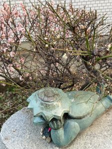 高円寺緑道公園の河童像の脇で、今年も紅梅と白梅が花をつけ始めました。これは、冬から春への確かな移ろいを感じさせます。左の紅梅が先に花開き、右の白梅がようやく咲き始めるという並びは、梅の世界ではごく自然な光景です。こうした紅白の対比は、日本人の感性に長く親しまれてきましたが、その象徴として最もよく知られているのが、江戸時代を代表する絵師・緒方光琳による紅白梅図屏風でしょう。