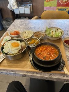 この二皿のご飯とスープ、そして副菜が数種つきます。副菜(パンチャン)が5皿添えられるのは韓国料理の特徴です。少量多品目の食事構成は栄養学的にも理にかなっています。自然に野菜摂取量が増える点は、現代人にとって歓迎すべきところです。