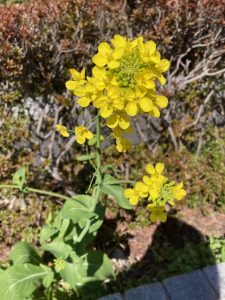 晴れた日曜日の午後、高円寺の桃園川緑道公園を歩いていると、鮮やかな黄色の花が目に入りました。春を代表する花、菜の花(ナノハナ)です。ほかの花のように植えられたのではなく雑草として生えてしまったものです。一本の細い茎の先に小さな四枚の花びらを持つ花が集まって咲き、まるで小さなブーケのように見えます。この花はアブラナ科の植物で、学名は Brassica rapa あるいはそれに近い栽培系統で、日本では古くから食用や油の原料として栽培されてきました。