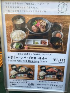 店名の通り、この店はハンバーグを主役にした専門店で、メニューも非常にシンプルです。基本の炭火焼きハンバーグセットは1400円台から用意されていますが、今回は店のおすすめという チーズをかけた「シロノソースダレ」2178円(税込) をいただきました。国産牛100%の挽肉を使い、炭火で表面を香ばしく焼き上げるのが特徴だそうです。炭火焼きにすることで余分な脂が落ち、肉の旨味が引き立つというのが店のこだわりとのことでした。
