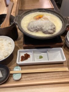 食べ進めていくと、チーズや肉汁が土鍋の底に残ります。私は最後に残ったチーズをご飯にかけていただきましたが、店の方によると ご飯を土鍋に入れてリゾット風にして食べるのもおすすめ とのことでした。こうした食べ方は、鉄板焼き店などで時々見られる工夫ですが、最後まで料理を楽しませる演出としてなかなか面白いものです。年齢を重ねると量の多い肉料理はやや重く感じることもありますが、小ぶりのハンバーグが2個という構成は私にはちょうどよく、最後まで無理なく食べることができました。