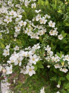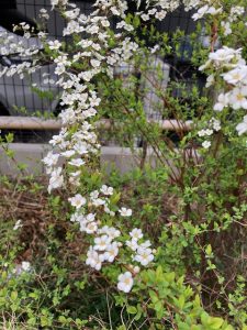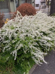 今朝、高円寺の緑道公園を歩いていたら、道ばたに白い小さな花が雪のように広がって咲いているのを見つけました。近づいてみると、細い枝が弓のようにしなり、その枝いっぱいに小さな五枚の花びらが並んでいます。