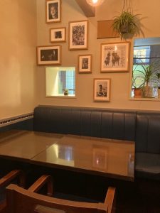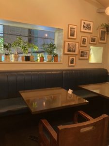 店内でまず印象的なのは、天井の高さと構造です。山小屋を思わせるように天井は緩やかな傾斜を持ち、その下に太い梁が渡されています。この梁が空間に奥行きと温かみを与え、木の質感と相まって、都会の中にありながらどこか静かな避難所のような雰囲気を醸し出しています。カウンター席とテーブル席がバランスよく配置され、ひとりでの軽い食事から、ゆったりとした会食まで対応できる懐の深さを感じます。
