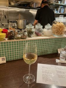 今日は終業後でしたから、食事に合わせていただいたのは白のハウスワイン。ピエモンテ産(ピエモンテ州はイタリア北西部に位置する州)とのことで、香りは穏やかで口当たりが非常に柔らかく、料理の味を邪魔せず自然に寄り添います。特筆すべきはその提供の仕方で、大ぶりで縁の薄いグラスにたっぷりと注がれ、気取らない豊かさを感じさせてくれました。こうしたサービスのさりげない心配りも、この店の魅力の一つでしょう。
