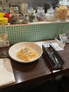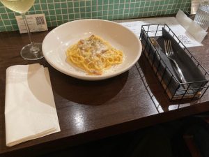 さて、この日の目的であるカルボナーラですが、提供までの工程にもこの店の丁寧さがよく表れていました。パスタは細めの麺を使用し、注文が入ってから一皿ごとに計量して茹で上げます。ソースは卵をベースに、その場で仕上げるスタイルで、いわゆるクリーム頼みではない、卵のコクを活かした本格的な仕立てです。仕上がりは過度に重くならず、それでいて深い旨味があり、口に運ぶごとに素材の一体感が感じられます。細麺ゆえにソースの絡みが良く、全体として軽快さと濃厚さのバランスが見事でした。日本人の嗜好に寄り添いながらも、イタリア料理としての芯を外さない、そんな印象を受けます。