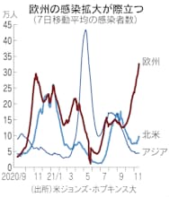 欧州の1日当たりの新規感染者数は30万人以上で推移している。一時落ち着いていた感染者数は9月以降急速に増え、足元では2020年のピーク時を超えて最多の水準だ。北米やアジアなどと比べても欧州の突出ぶりが目立つ。