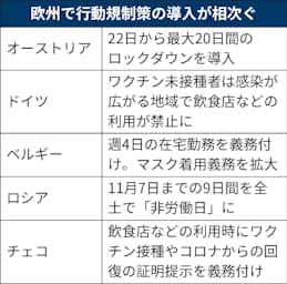 新型コロナウイルスの感染が再拡大している欧州で、ロックダウン(都市封鎖)などの行動制限に逆戻りする国が相次いでいる。オーストリアでは22日からロックダウンに入り、ワクチン接種も義務化する。厳しい行動制限には国民の反発が大きく、経済を冷え込ませる。感染抑制と経済の両立に向けて各国で手探りが続いており、欧州連合(EU)は治療用飲み薬の緊急使用を承認した。現状では感染が抑えられている日本も今後の対応策を検討する必要がある。